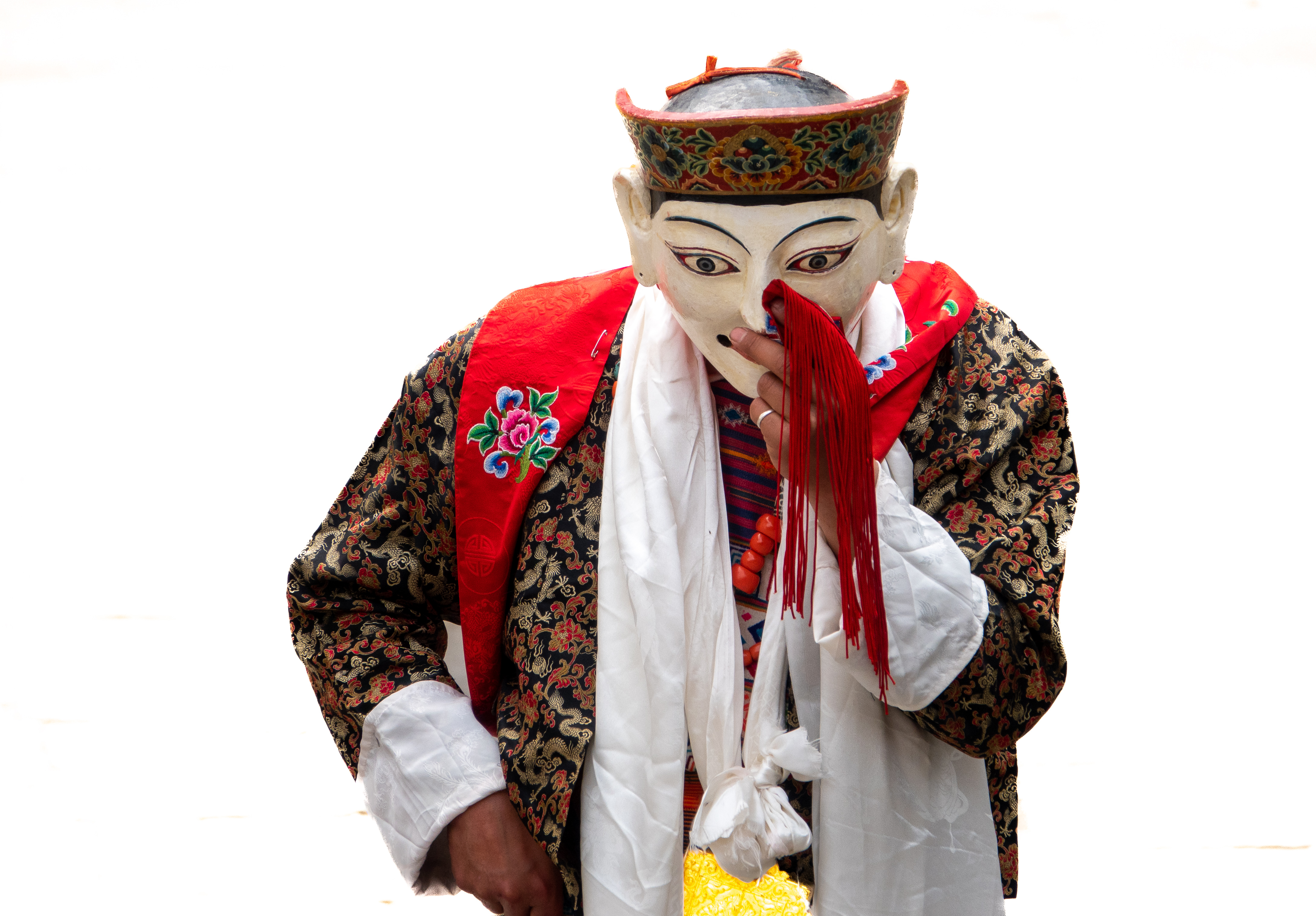 The day long open air event is a riot of clour and hosts masked dancers, monks dancing, jesters and there is a Tantric cham. One of the tantric visual aids for meditative practice is the mandala, which means “circle.” In Buddhism it is a device for leading the initiate deeper into the realization of the nature. The dancers are accompanied by monk musicians chanting and playing long horns, clarinets, cymbals, drums, and conch shells. The red-masked Atsara figure is a traditional comic character, his act combining wit and wisdom, humour and responsibility. His role is to help the audience to forget their worries with his jokes and to puncture their self-importance, hypocrisy and false propriety through his pranks.